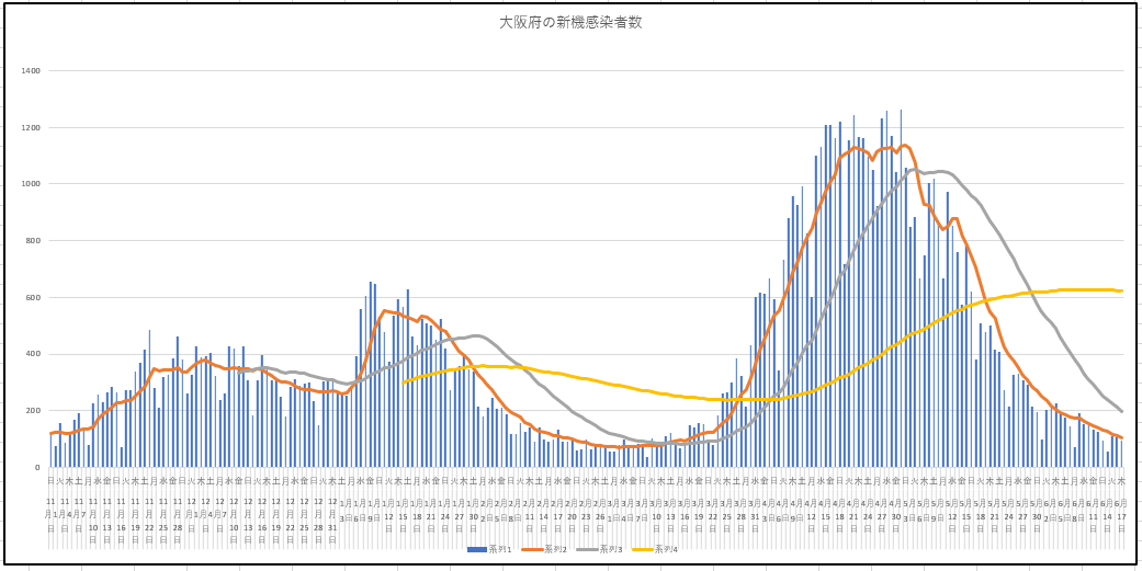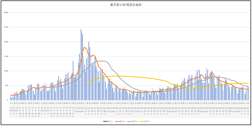 東京都の新規数は7日移動平均線の上に出て、次に降りて