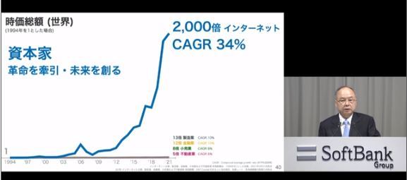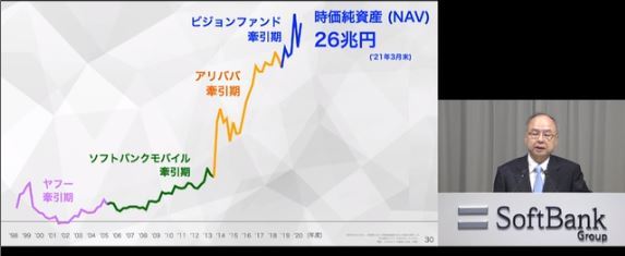 ②純利益では5億円、時価純利益(NAV)は26兆円と成長をしている。yahoo→ソフトバンクモバイル→アリババ→ビジョン」ファンド