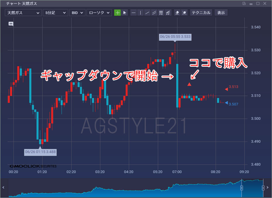 日曜日の記事で「翌日買う銘柄」として公表した「天然ガス」ですが、朝7:00のマーケット開始から見ているとギャップダウンの下落でスタートでした。
