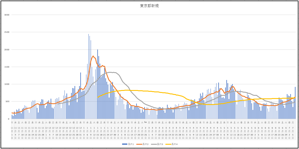 新規患者数推移。あるよねー、て感じ。わりと軽く考えてるでしょう?自分もそう。雰囲気的には軽い感じがするのだけど。慣れちゃったのかも。