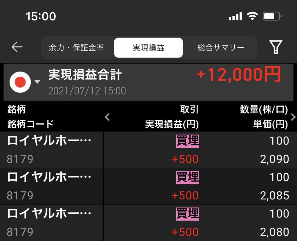 空売り、7/12の実現損益は+12000円