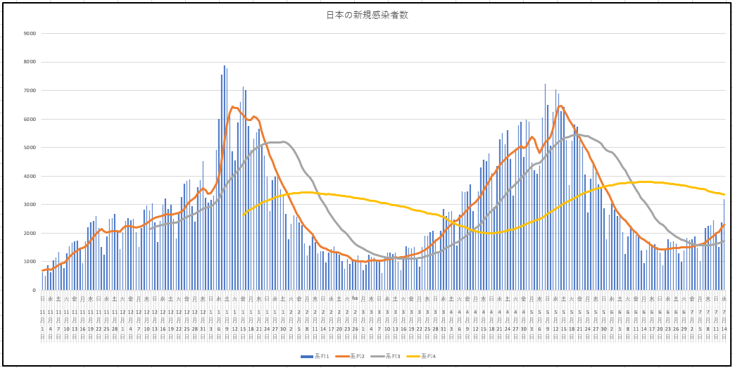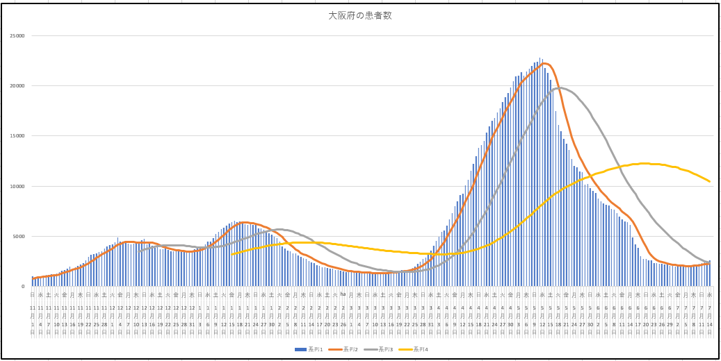 ひさしぶりに大阪府の新規と現存患者数の推移グラフ。上昇に転じています。東京と同様に重症や死者は減っていますが・・・阪神首位が原因とか?