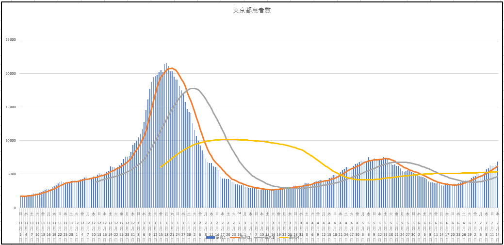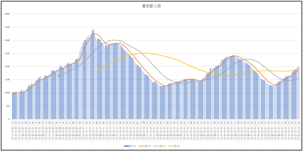 東京都の新規感染者数の推移。老人の感染は減り、重症者も減るが、若年層の患者が増え続けている。東京都の入院患者は2000人を越えたがほとんどは中等症、軽症なのだが・・・