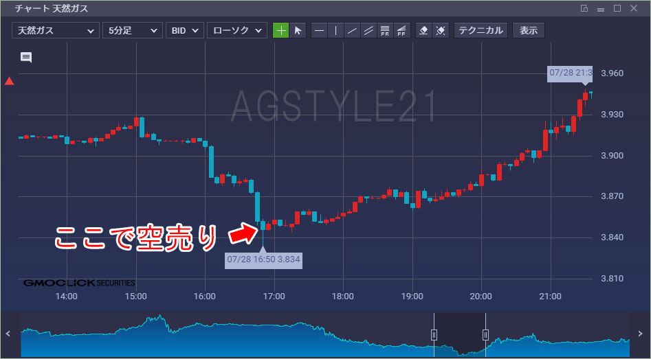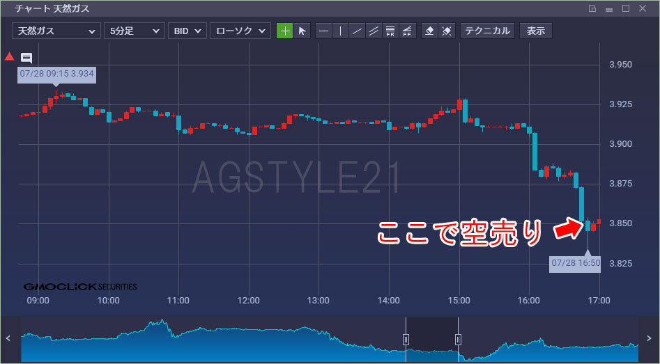 流石にここら辺が天井でしょうか。これからは下落トレンドかな?と反省しながらチャートを見ると今が正に下落の真っ最中で早く空売りしないと儲けが減る!という絶好の空売りチャンスでした。