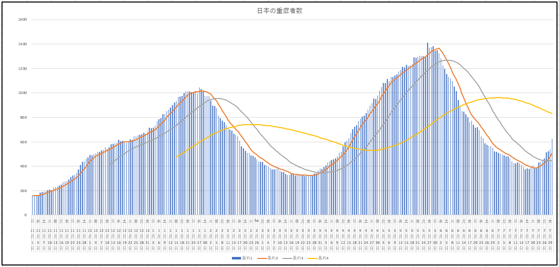 7月30日までの日本全国の新規感染、現存患者数、重症者数の推移。関東圏から全国に広まったって?それは分らんですね。連休や夏休みの威力かもだし。