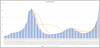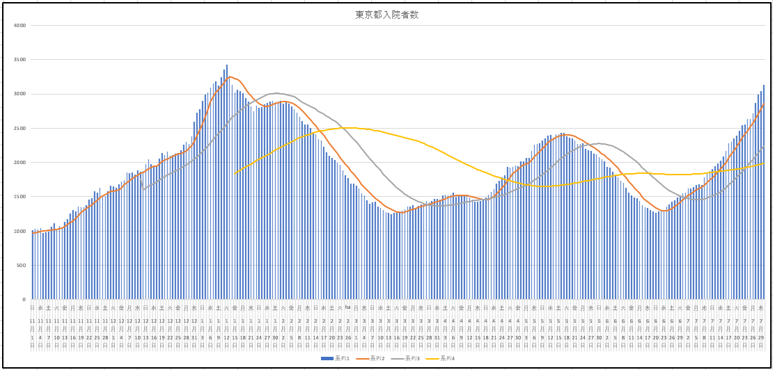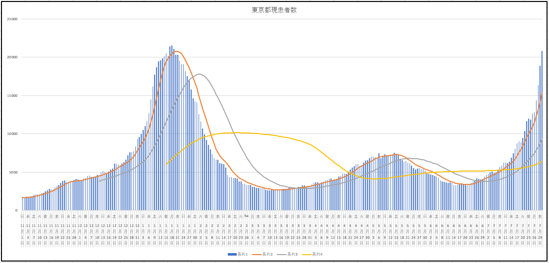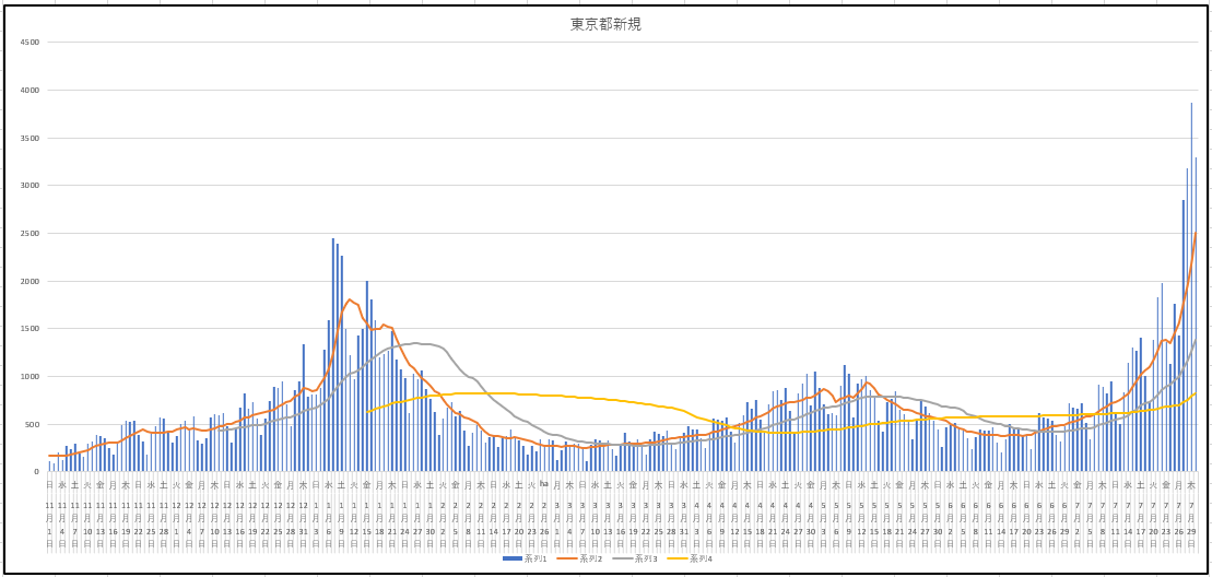 東京都の新規感染者数と現存患者数の推移。正月、GW等と結局同じようになるのですね。学んでない、とか・・・・