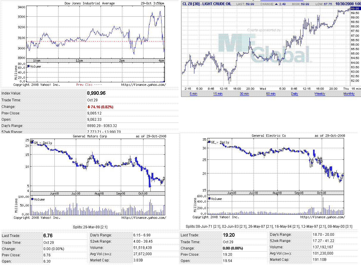 FRBは0.5%の利下げを決定し、FFレートを1%にしました。発表直後はふらついたものの、取引終盤にかけて上昇していきました。が、引け直前にストンと急落。GEのCEOの業績見通しについての発言が嫌気されGE株が急落したことが原因のようです。(後ほど、そんなこと言ってないよと訂正されました)