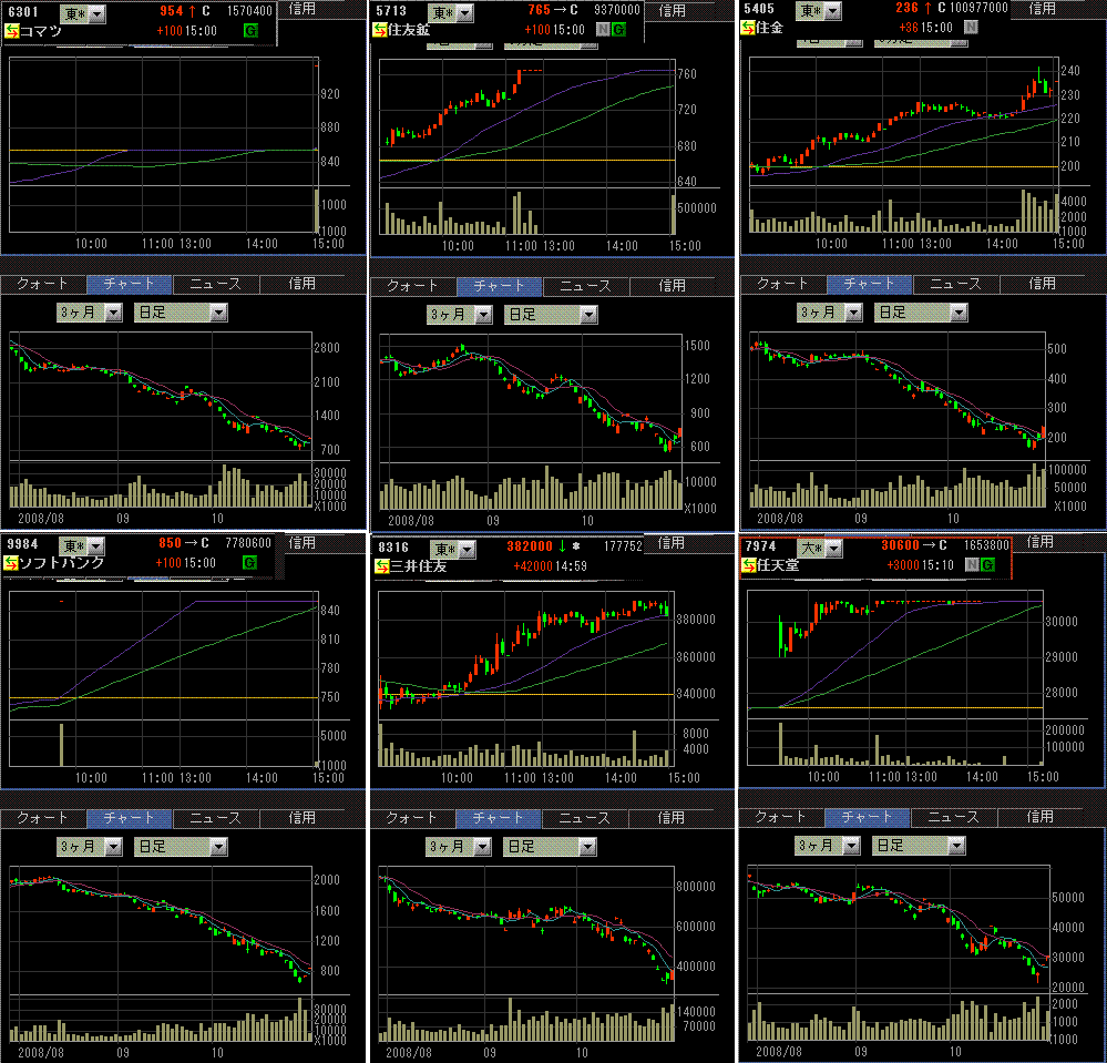 私は最悪のパターンで、トヨタ株を持っていましたが、あまりに下落が酷いので、自動車より、立ち直りが早いと思ってコマツにかえたら、下落がもっと酷くなり、追証対策で何度も損切りをさせられ、何も出来ない状態まで追い込まれました。しばらくは修行です。