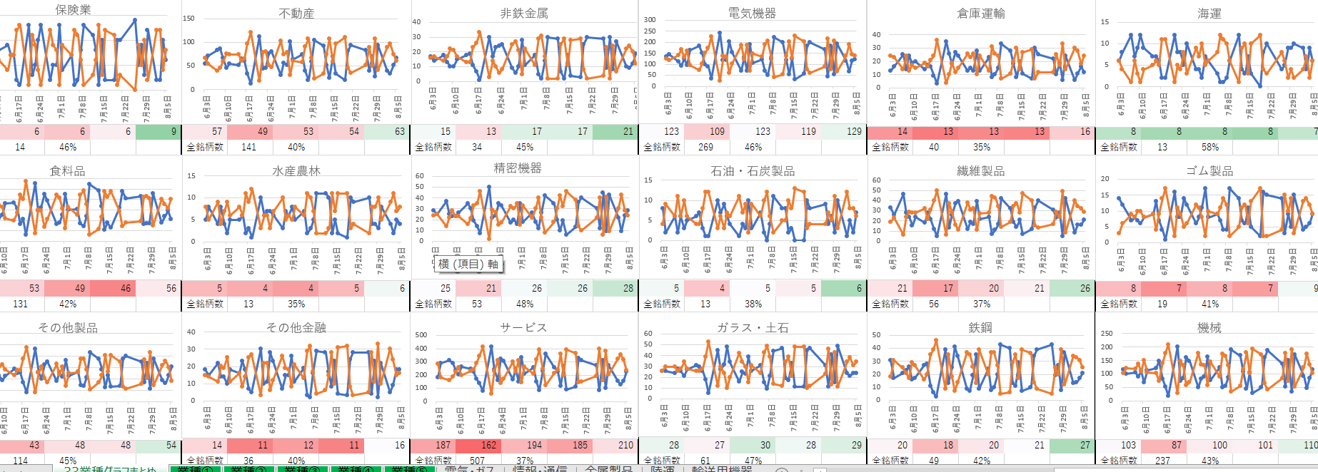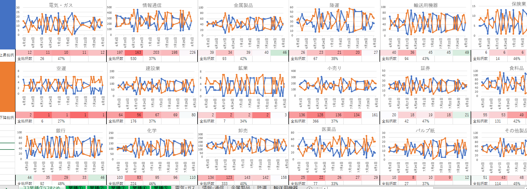 業種に属する銘柄の値上がり数と値下がり数を算出したものとなります。