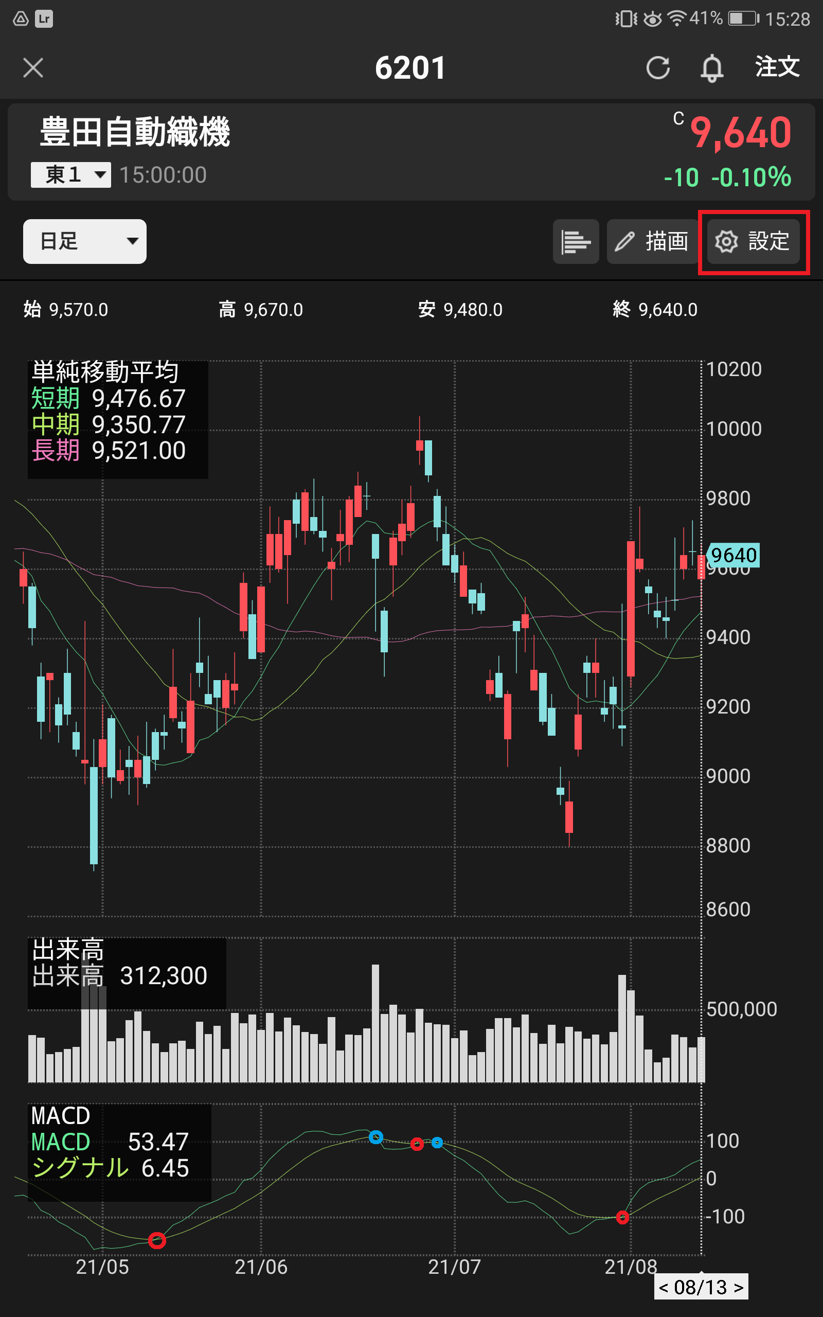さて、長くなってしまいましたが、iSPEEDでMACDを設定していきましょう。わかりやすさのために豊田自動織機 6201 の画面をアップしておきます。