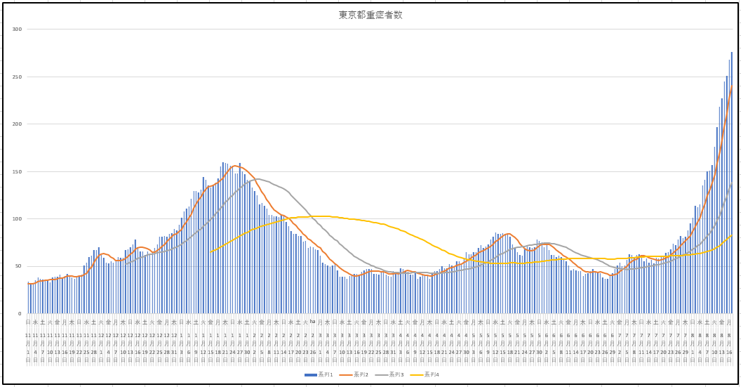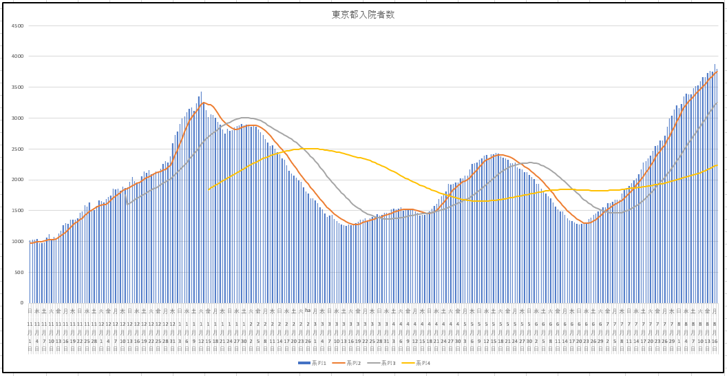 東京都の新規感染、入院患者数、重症者数の推移グラフ。