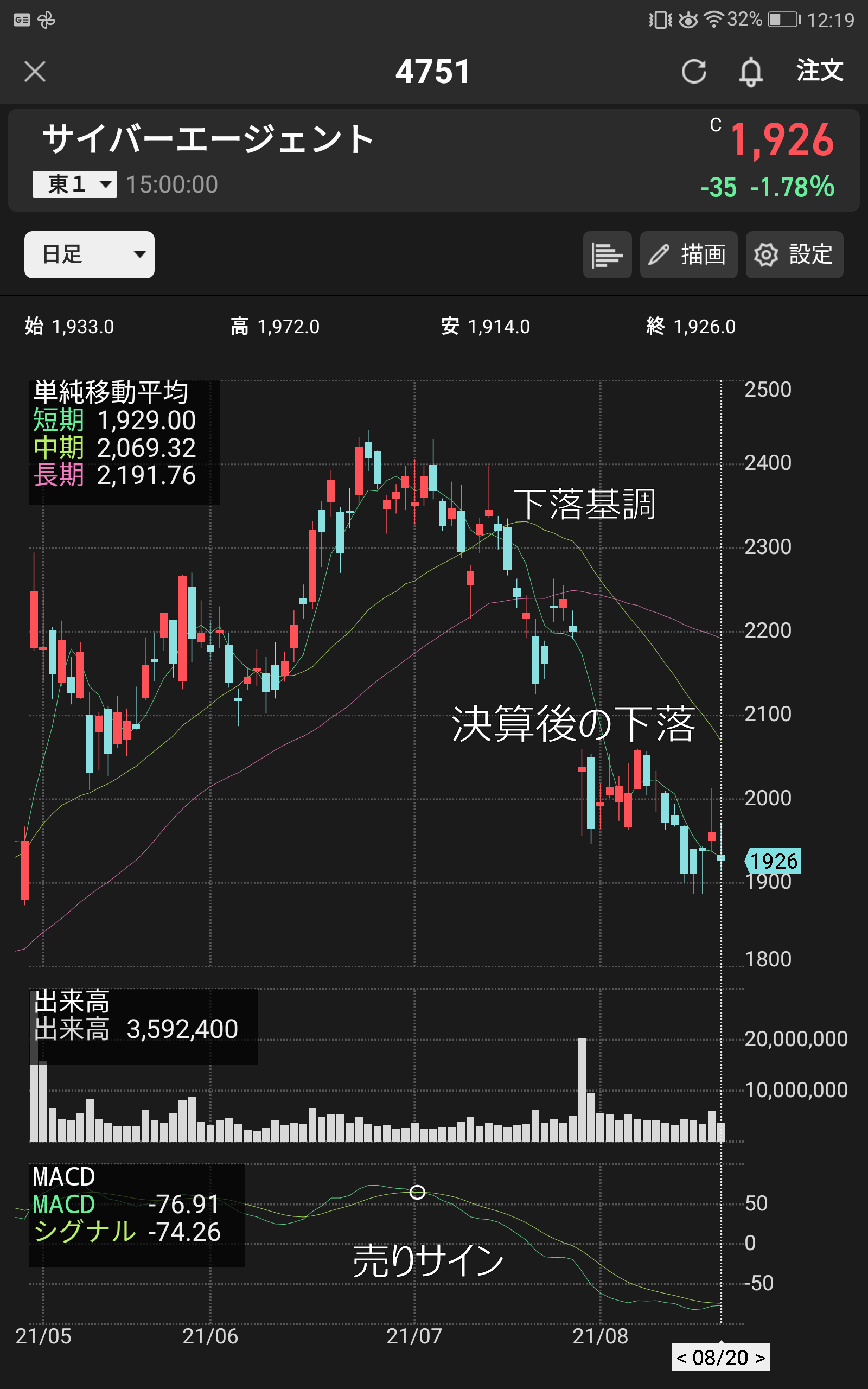 1つはすでに株価は下落トレンドだった、というのがあります。画像を上げます。MACDの売りサインは7月頭にでていて、その後基本的に下落トレンドを示しています。この下落トレンドが、ウマ娘の人気のピークアウトを反映したものだったとすれば、納得です。