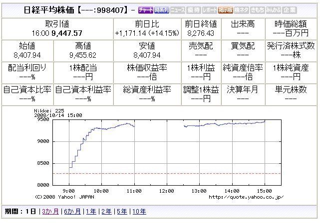 連休明けの2008年10月14日(火曜日)の日経平均株価は、