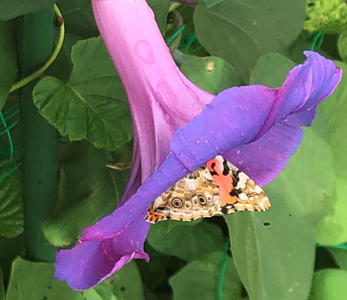 南米産の朝顔に蜜を吸いに来たタテハチョウ。