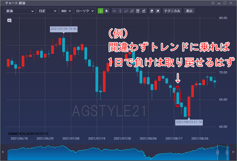 エントリー、エグジットするタイミングは悪かったものの日足チャート、分足チャート、どう見ても原油は上昇トレンドのようだ。