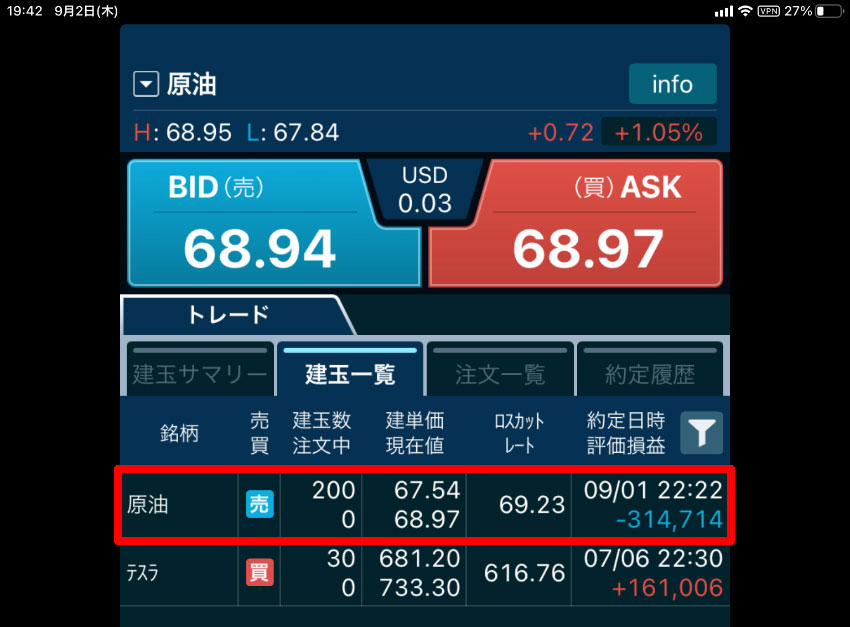さて、マーケットオープンから1時間程度経過し原油は上昇トレンドで間違いないことを確認しロング(買い)!