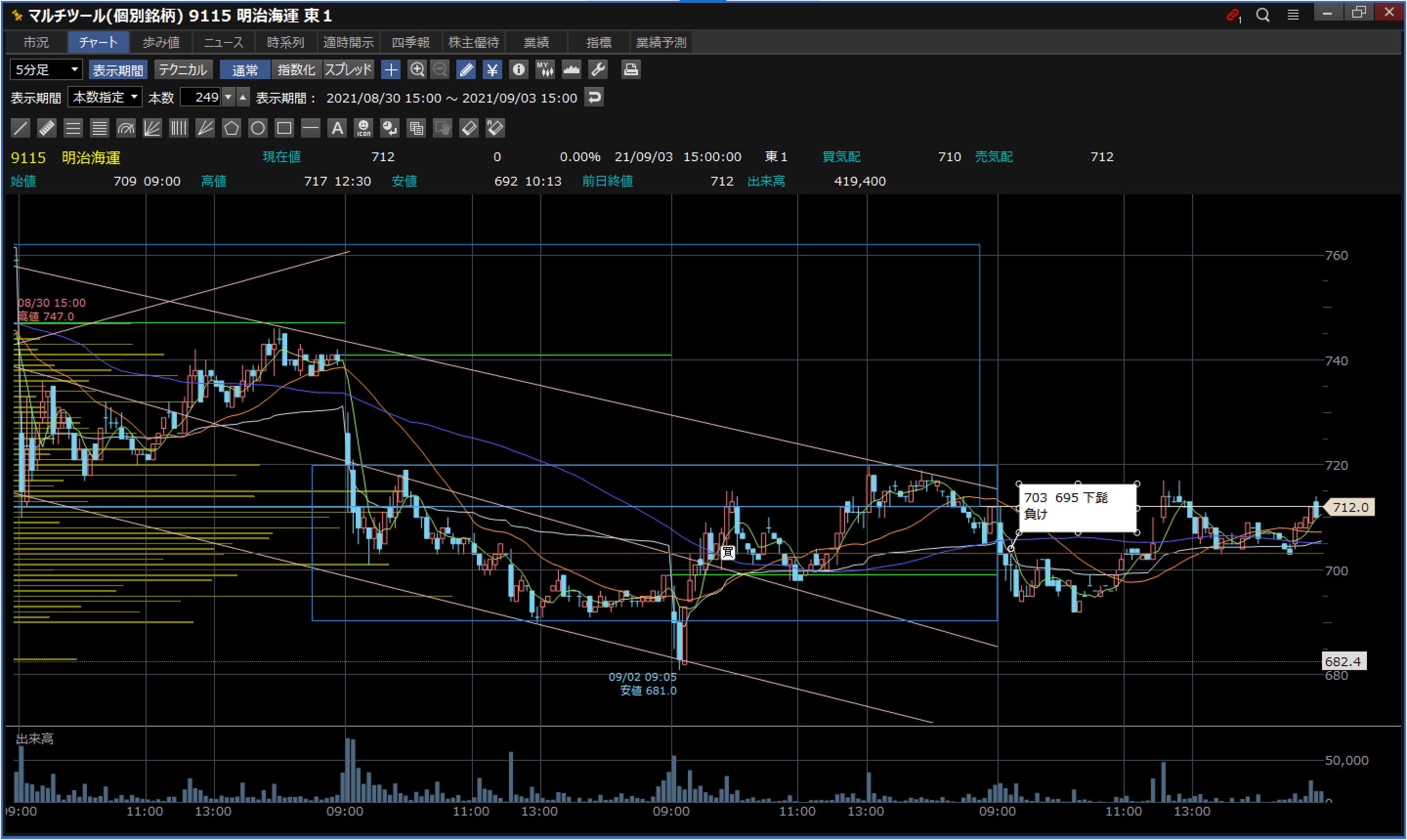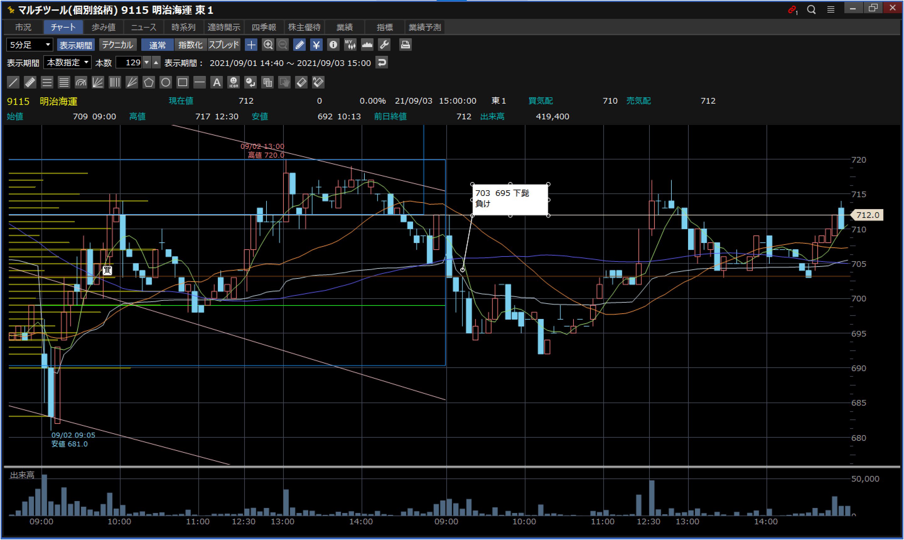 反省:五日移動平均線下突なので下落トレンド、下抜け解放だと
