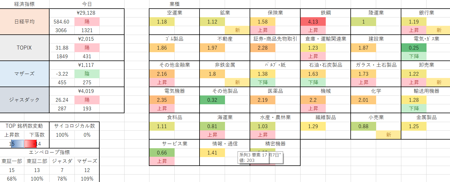 業種に所属する個別銘柄の値上がり数と値下がり数が大事です。