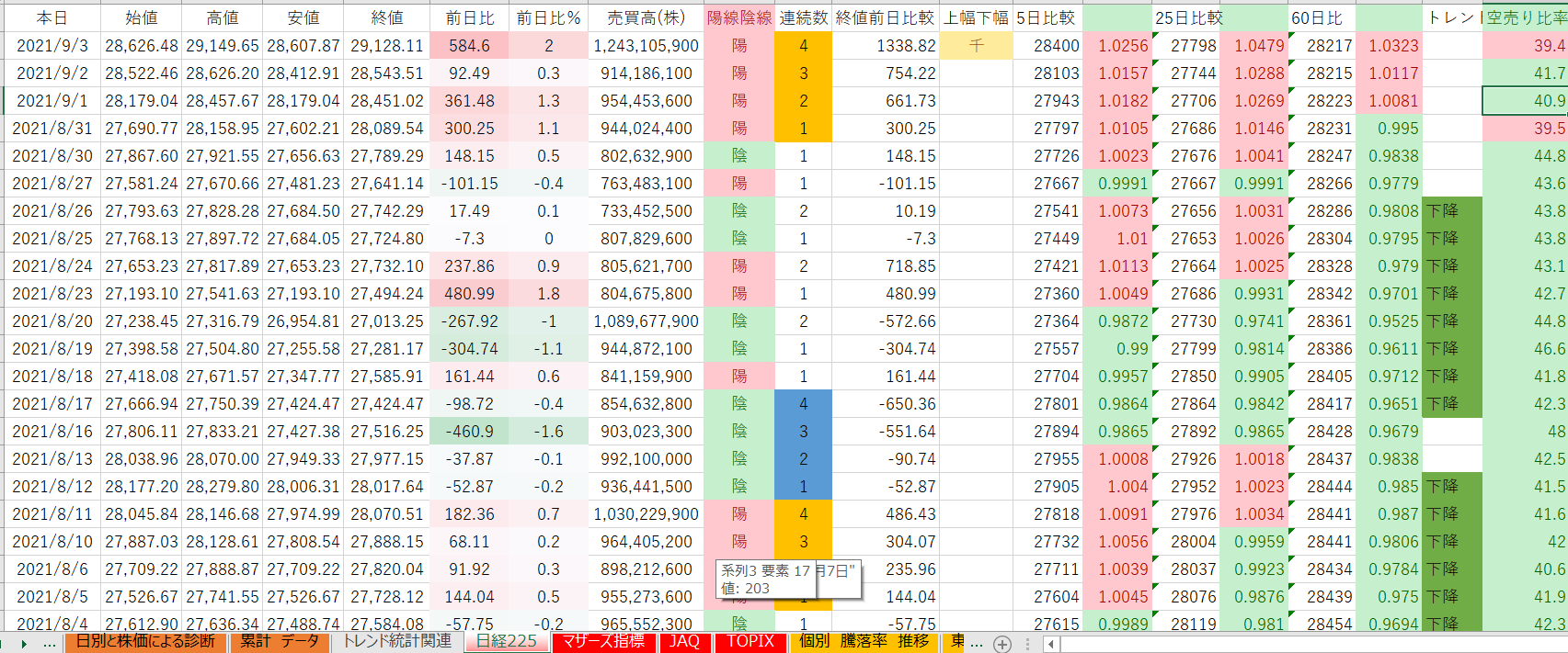 空売り比率と60日線を上回っているかどうか。
