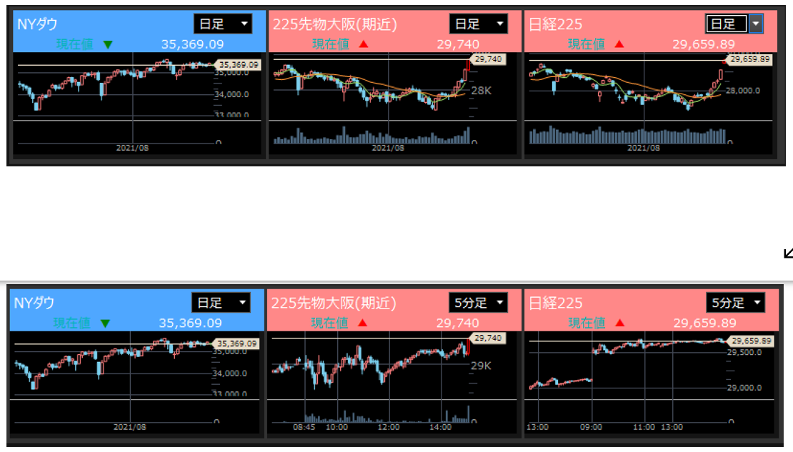 先物は上髭からの弱い展開かと思いきや日経開始には強い展開、日経もGU