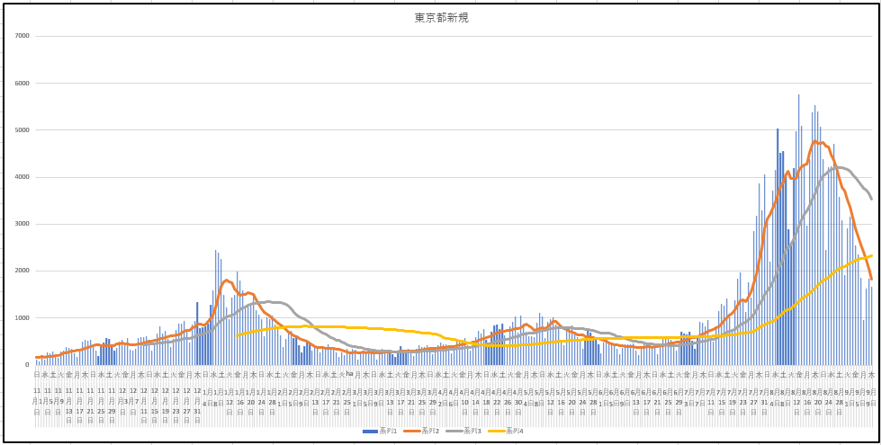 東京都の新規感染者数推移。高いところからは激減しているが、そろそろ1000人規模で先週同一曜日を下回るのは終わりかも。水準は、あの悲惨だった正月明けのあたりにまで減りました。年齢層とか重症率とか中身が違いますがね。