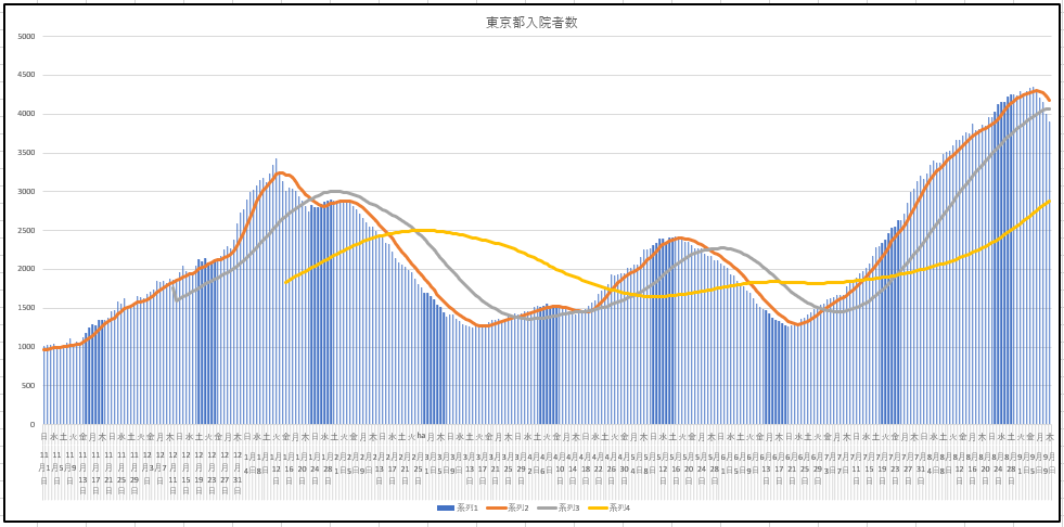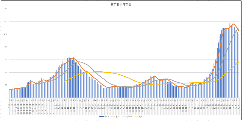 ひさしぶりに東京都の現存患者数、入院者数、重症者数の推移を載せておきます。