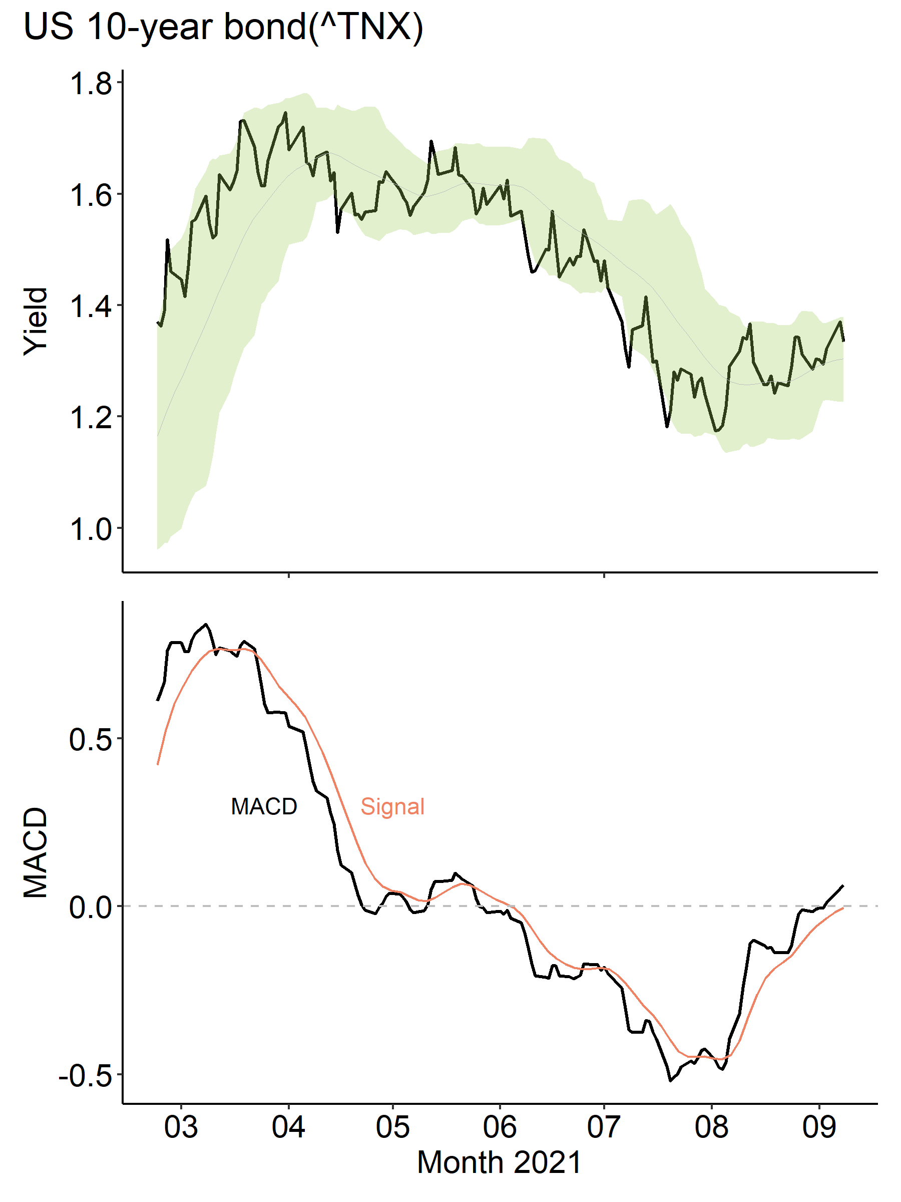 米国10年債金利をみてみます。画像を上げます。今年の米国10年債金利の日足のデータをグーグルドライブのスプレッドシートで取得し、Rで描いたものです。上の図の黒い線が金利、薄緑がボリンジャーバンドです。下の図が金利のMACDとなっています。