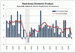 米商務省が10月30日発表した7-9月期の実質国内総生産(GDP)の速報値は季節調整済みの年率換算で前期比0.3%減った。四半期のマイナス成長は2007年10-12月期(マイナス0.2%)以来。 成長率の低下幅は01年7-9月期(マイナス1.4%)に次ぐ大きさとなる。ただ低下幅は市場予測(マイナス0.5%)より小さかった。世界では日本とドイツが4-6月期、英国が7-9月期にそれぞれマイナス成長で、日米欧の主要国がほぼ同時期にマイナス成長に突入した。7-9月期はGDPの7割を占める個人消費が17年ぶりにマイナスに転じた。設備投資、住宅投資など内需は総崩れで、成長を支えてきた輸出も鈍化した。