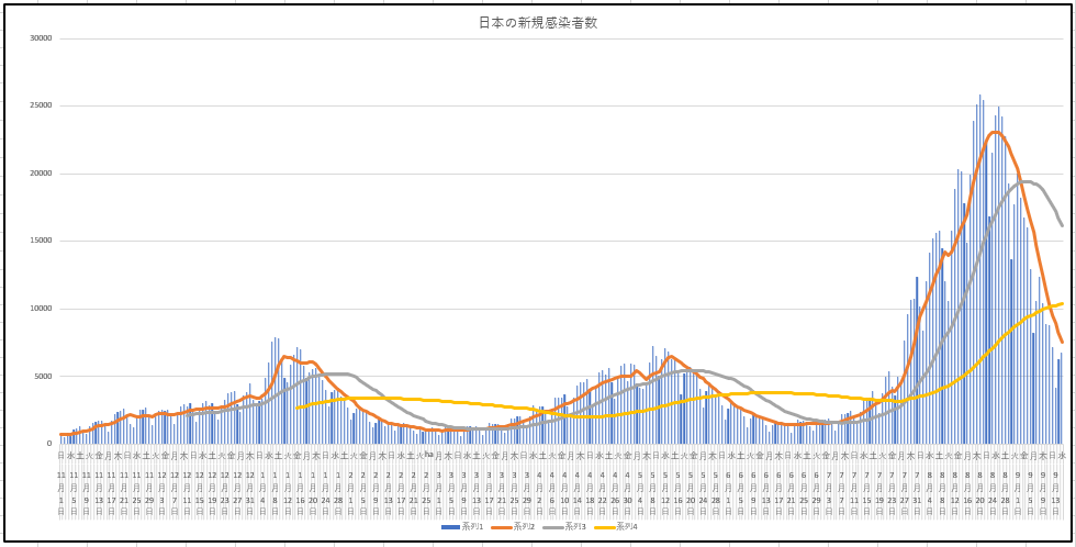 昨年11月から昨日までの、新規感染者数、現存患者数、重症者数の推移。
