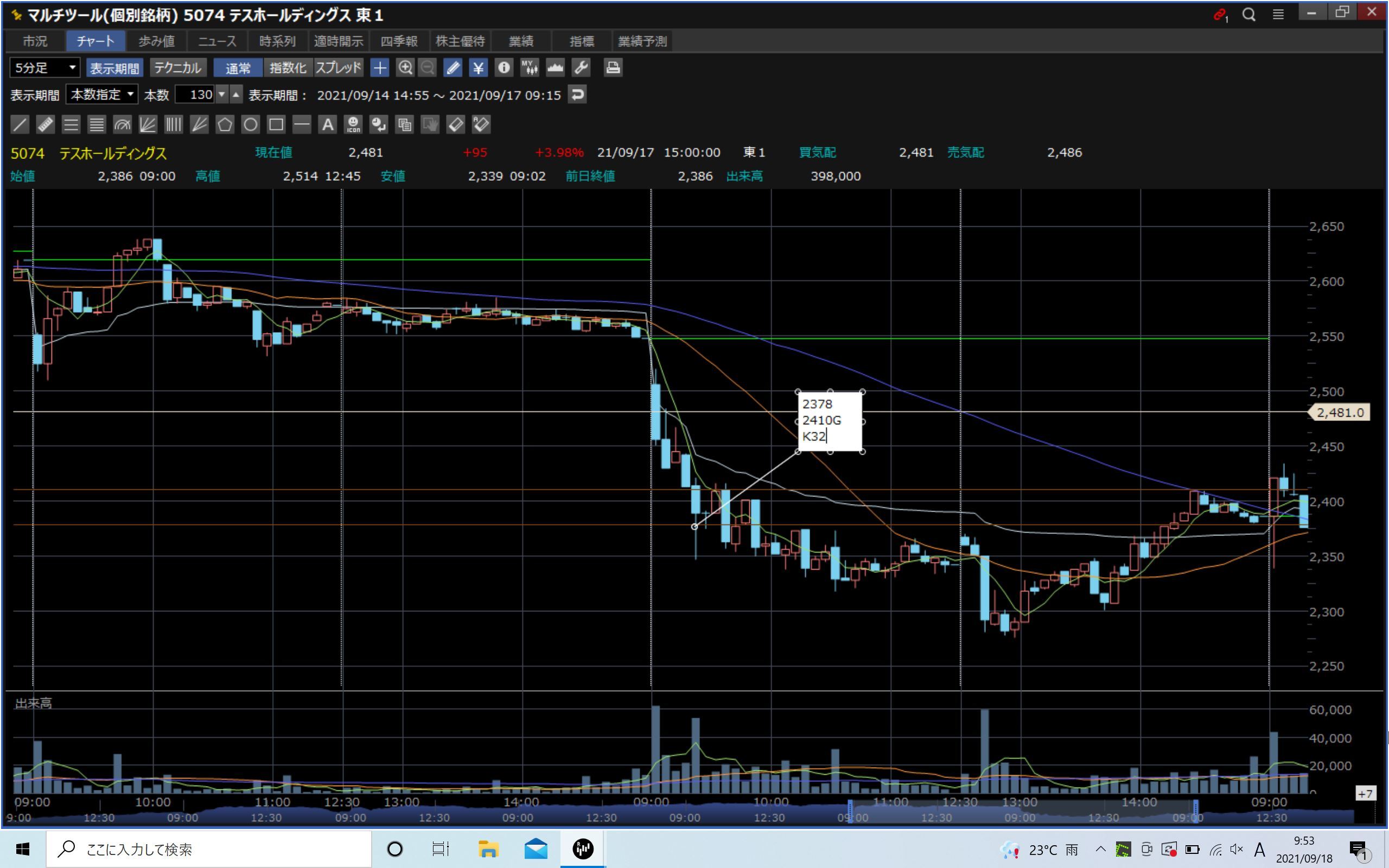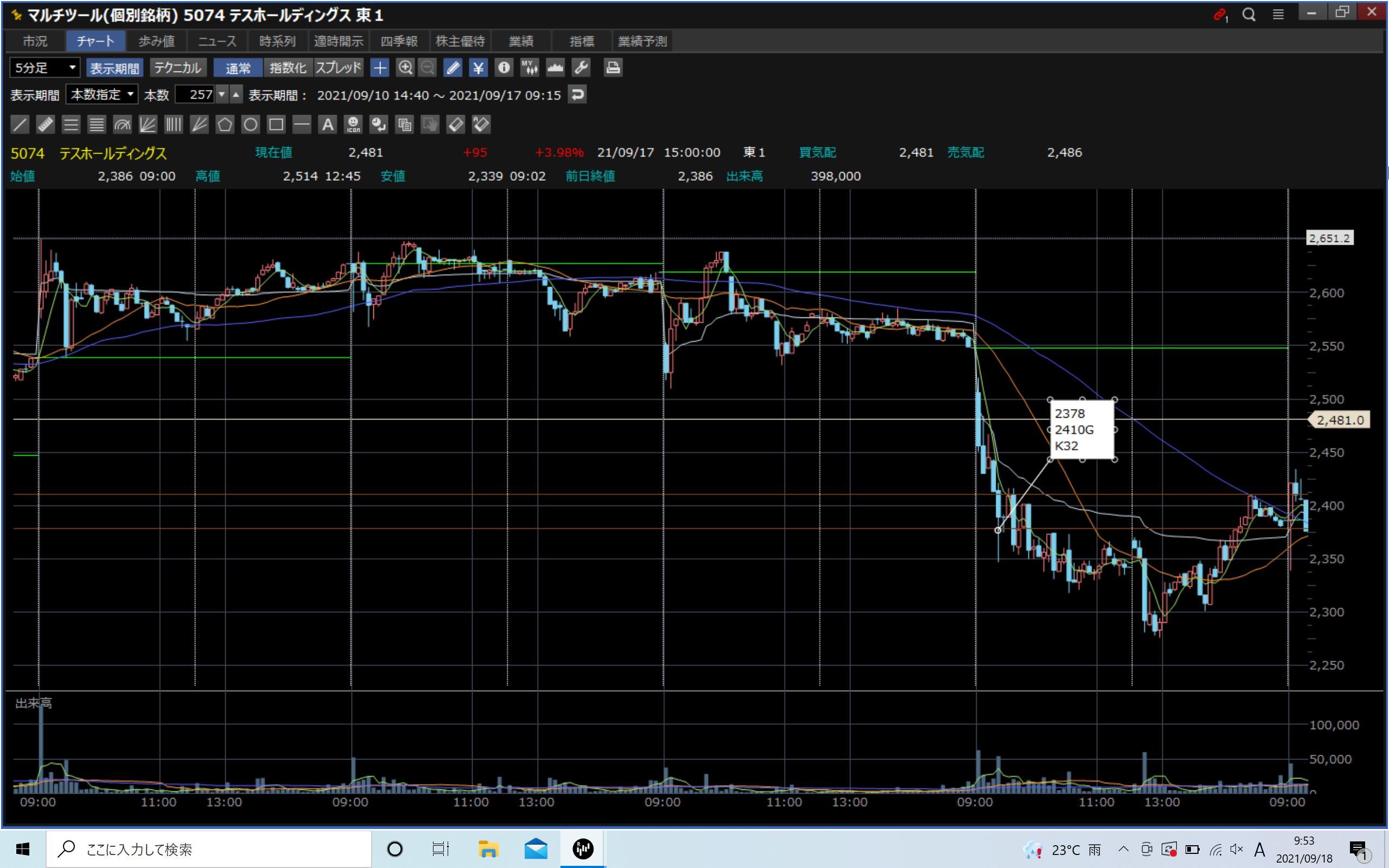 当日:場中↘下髭乗り×(下降トレンドに要注意、短期〇)