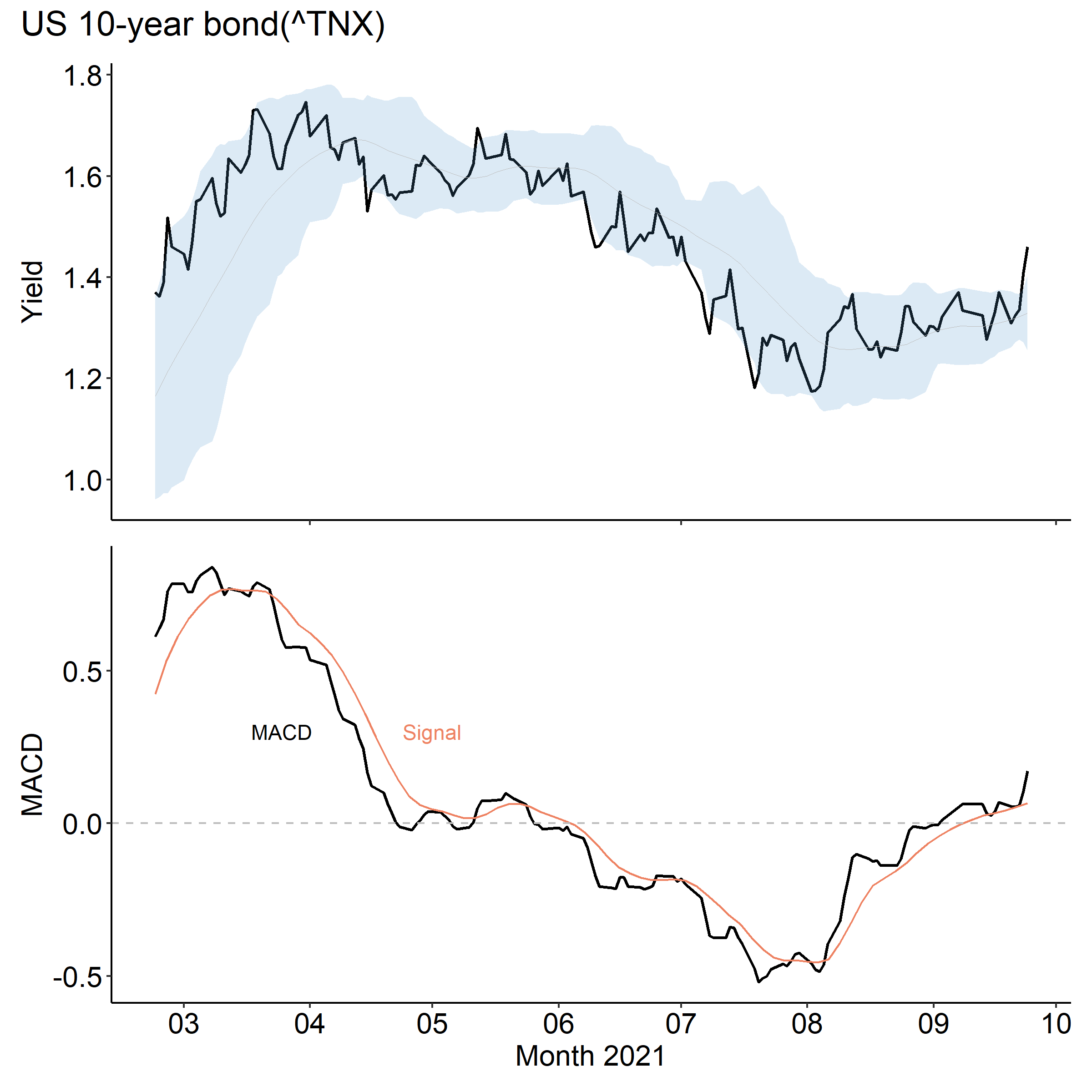 おそらく来年テーパリングが終了すると、FRBの政策金利の引き上げがいよいよ視野に入ってきます。ここで米10年国債の利回りをみてみましょう。前々回に添付した図を更新したので添付します。私の推測通り、ヨコヨコしていましたが、一昨日から急に上がってきました。ボリンジャーバンドを抜けてきているので、ここからしばらく上昇が続くことが予想されます。そうなると株価はなかなか上がらなくなります。特にハイパーグロース株には厳しいと思います。実際、NASDAQ総合指数は前週比であまり上がってきていません。