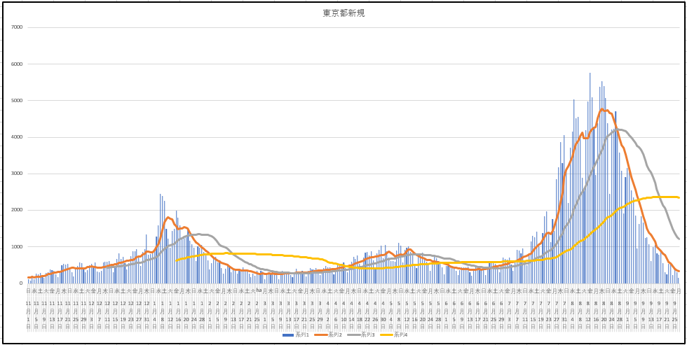 東京都の新規感染者数の推移。縦軸をピーク時に合わせているので、底のほうはもはや見えないくらい低くなってきました。個人的にはまだマスクはしております。