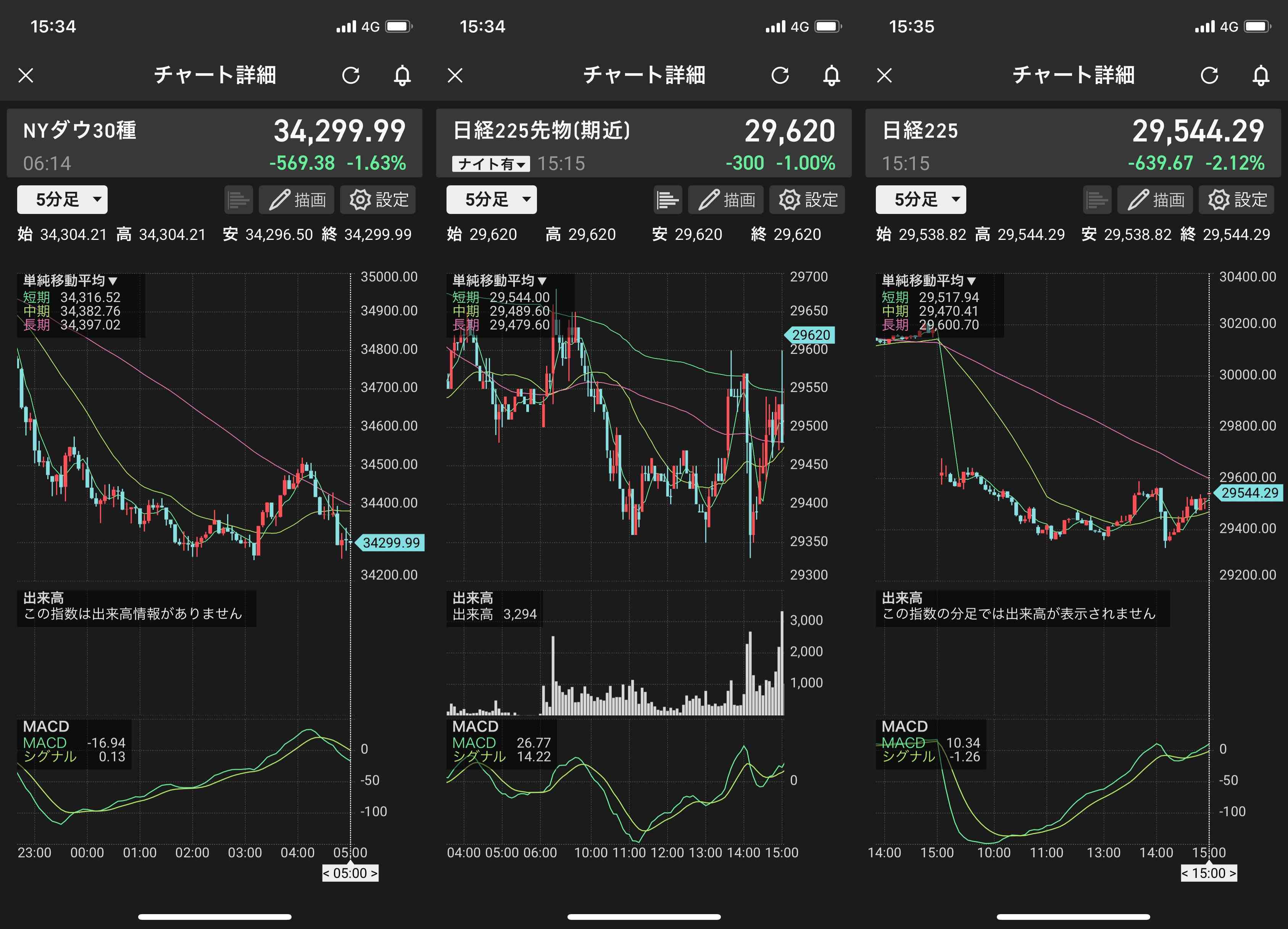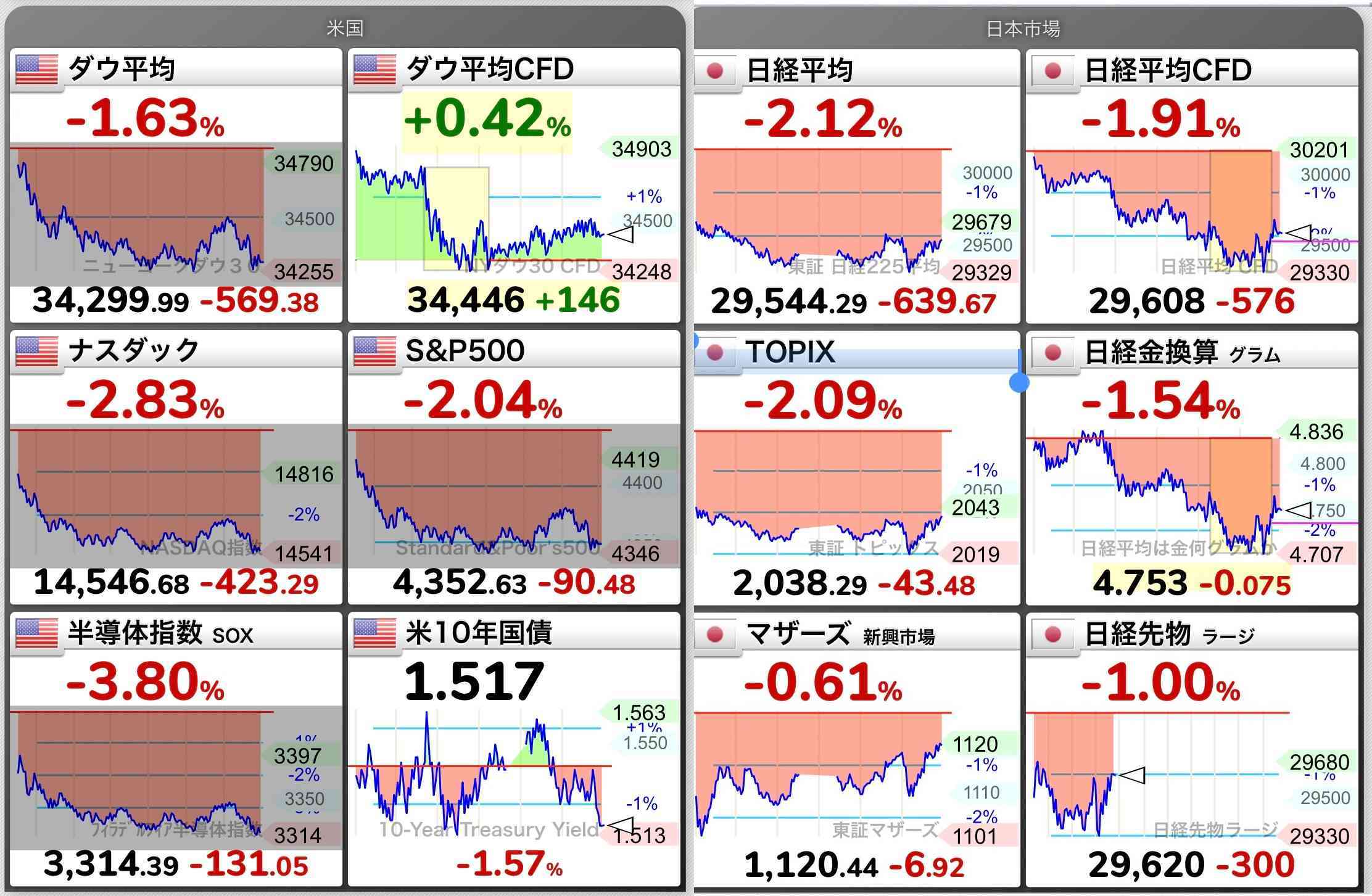 さて、東京市場は米国の金利上昇という難題を抱え本日は売り一色のスタートに。時間外取引でも米金利は上昇傾向にあり、また中国株安などもあって一段と下値を広げる展開となった。特にPERの高い(金利に弱い)半導体などハイテク株が売られている。チャート上では下値25日移動平均線(2万9405円)に達したところでセオリー通りの下げ止まり。一旦はここが効いてくることになるだろう。