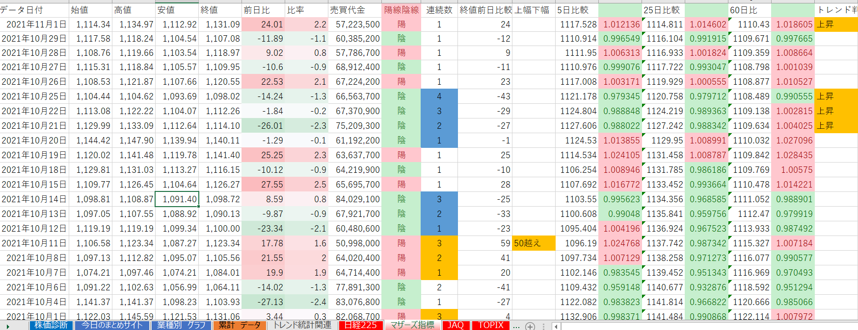 マザーズの上昇トレンド平均継続日数 24日 となります。