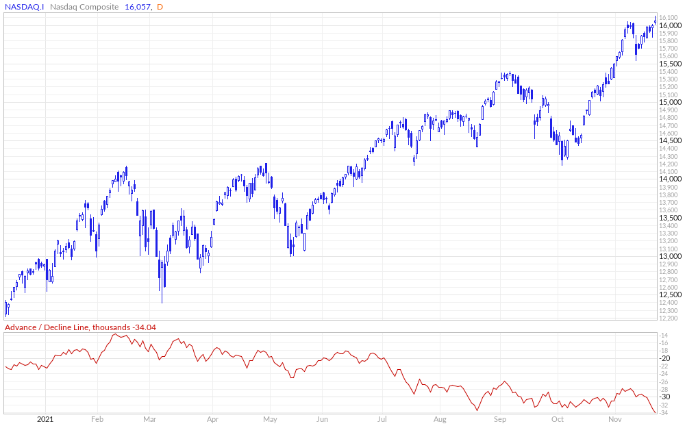 S&P500に比べてNASDAQ総合のほうがのびています。ここにきて年初来の伸び率で追いついてきましたね。すごいです。しかしNASDAQ総合も心配がないわけではありません。騰落株線(Advance Decline line)が下降しているのです。図を添付します。一方NASDAQ100の騰落株線は上昇してるので、NASDAQは多くの銘柄が下がっているのに、一部のビッグテック銘柄が全体の平均値を引き上げている、ということです。このところテック系のグロース株がガクッと下がることがよくありますが、その印象と矛盾しません。