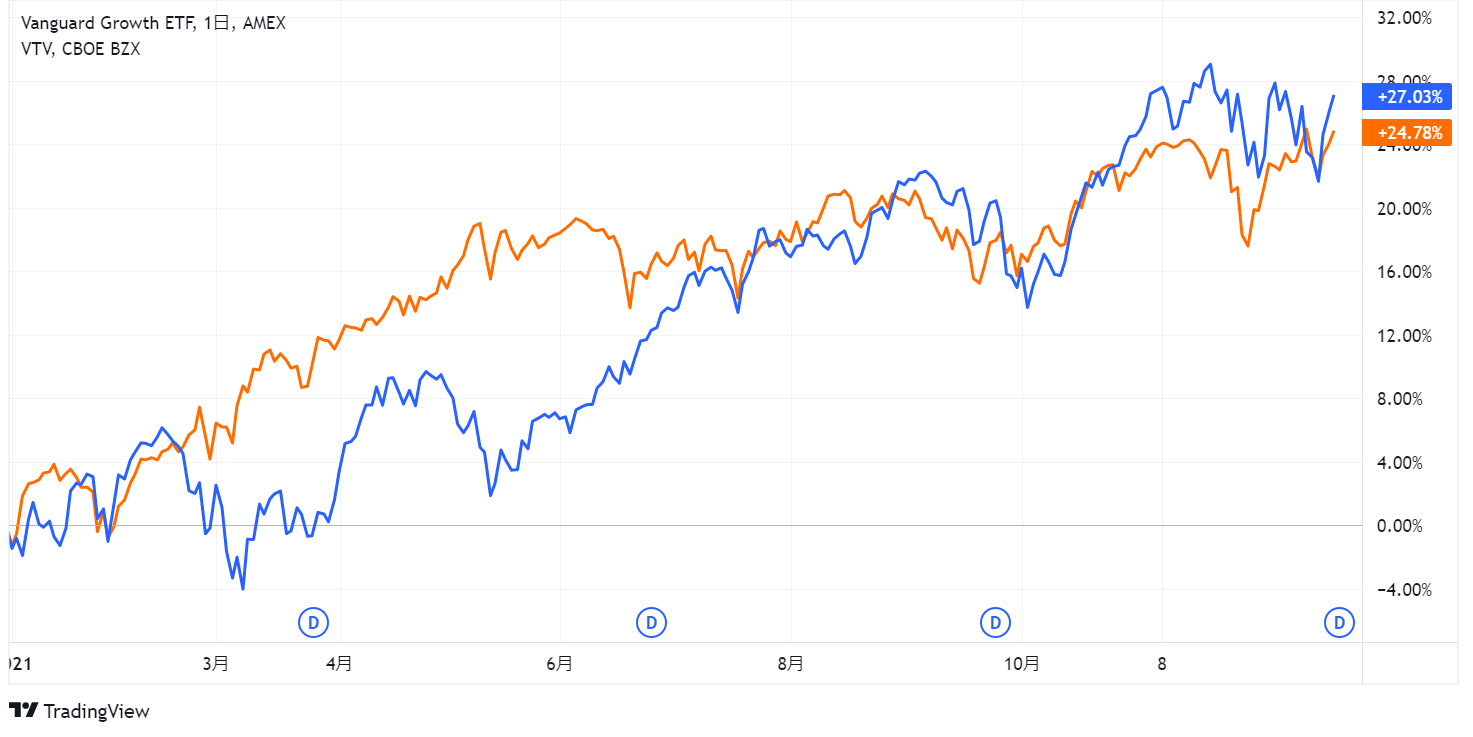 金利が上がる状況ではグロース株が弱いので、来年はバリュー株が強いと言われていますが、どうなるでしょうか。とりあえず今年一年のバリュー株とグロース株を比較してみましょう。図を添付します。