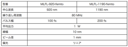 当社では同社が手掛けるレーザー関連製品の中で、波長920 nm及び1190 nm、パルス幅100 fs及び200 fs、平均出力1 W、繰り返し周波数80 MHzのフェムト秒レーザーが発振可能なモードロックフェムト秒モジュール(型番:MLFL-920/1190-femto)、構造化照明顕微鏡法、光遺伝学、量子制御等の用途に活用されている465 nm - 775 nm波長帯域で青、緑、黃・オレンジ及び赤色可視光に対応した連続波(CW)ファイバーレーザーモジュール、を中心に取り扱いを行っています。