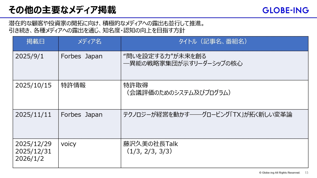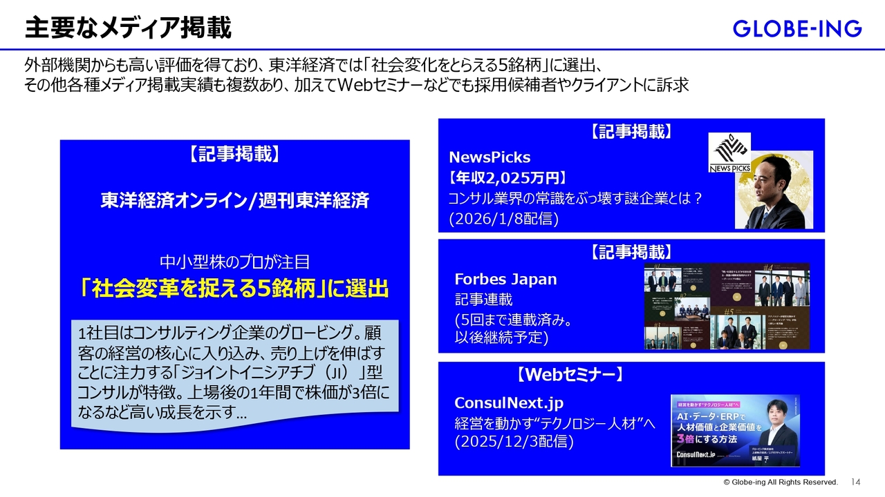 主要なメディア掲載についてです。この期間中、「東洋経済」の「社会変革を捉える5銘柄」に選出されたほか、「NewsPicks」での記事掲載、「Forbes Japan」では連載記事を掲載するなど、主要メディアに取り上げていただく機会が増えてきました。