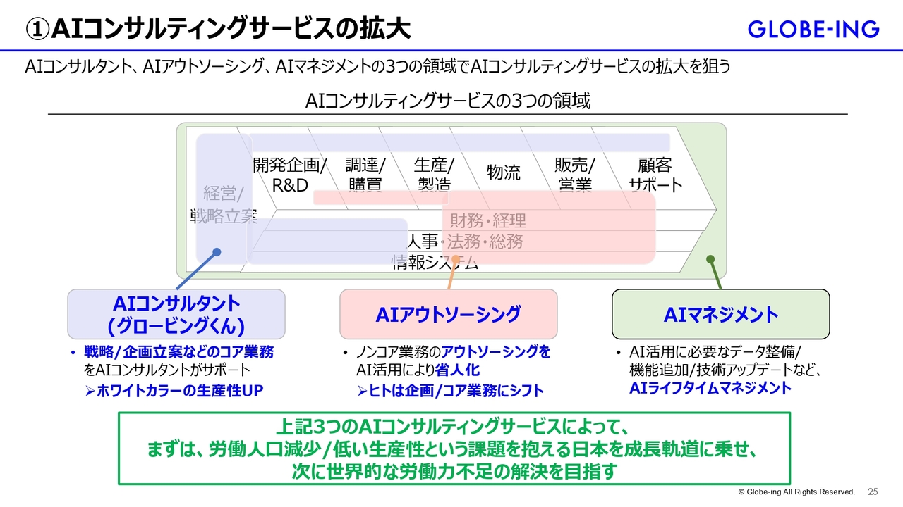 先ほど触れたAIコンサルタント「グロービングくん」のように、ホワイトカラーの生産性を向上させることはもちろん、ノンコア業務でアウトソーシングを活用している企業に対し、さらにAIを活用して省人化を進めていきたいと考えています。その結果、人材が企画やコア業務にシフトしていくことを目指しています。