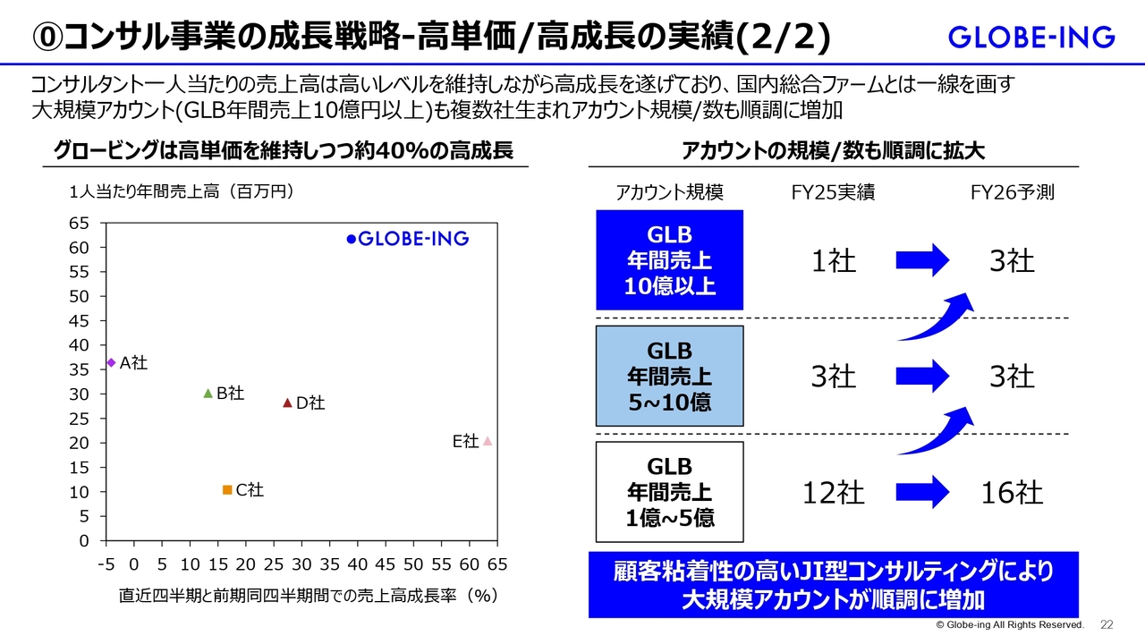 全体として、アカウント数を増やしながら大規模アカウントも拡大しており、顧客粘着性の高いJI型コンサルティングにより、大規模アカウントが増加していると言えると思います。これにより、1人当たり年間売上高6,000万円という高水準を維持しつつ、成長を達成しています。