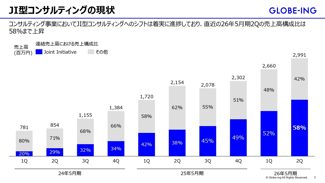 JI型コンサルティングは順調に伸びており、比率を着実に上げることができています。今四半期は60パーセント近い水準にまで上昇しました。