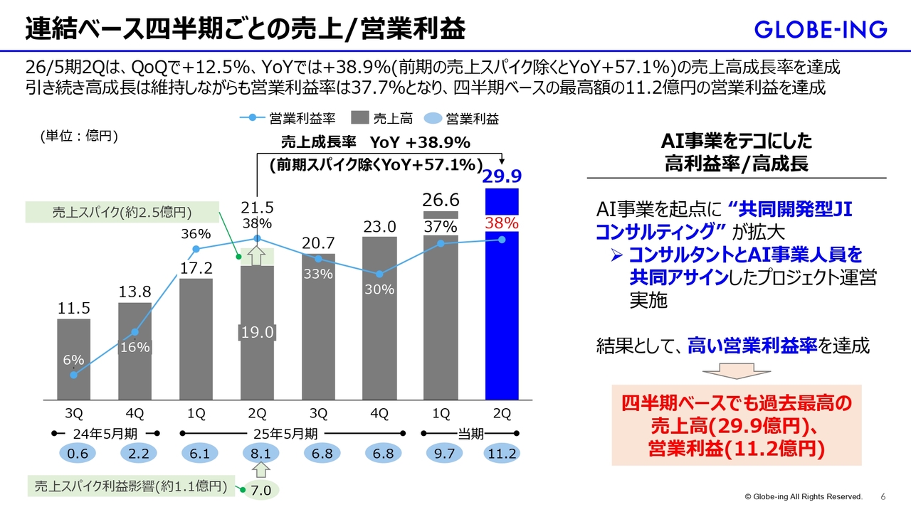 営業利益率も、37.7パーセントと非常に高い水準を維持したまま成長しています。この成長の背景については第1四半期でもご説明しましたが、AI事業を起点とした共同開発型の「Joint Initiative型コンサルティング(以下、JI型コンサルティング)」案件の拡大が挙げられます。