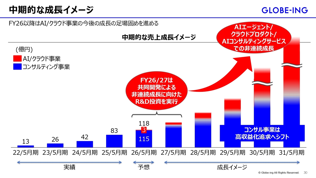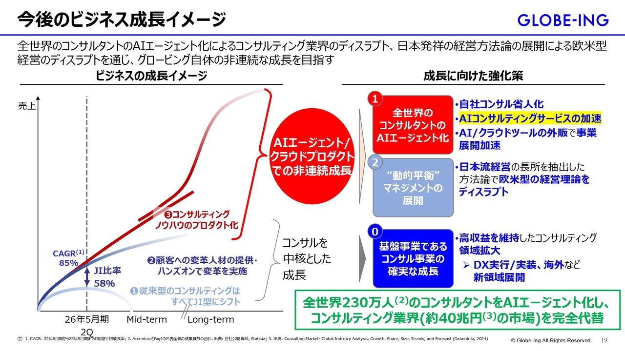 これまでしっかりと成長させてきた基盤事業であるコンサルティング事業は、今後も高収益を維持しながら領域を拡大させていく方針です。その上で、AIエージェントやクラウドプロダクトにおいて、全世界のコンサルタントをAIエージェント化することを目指します。
