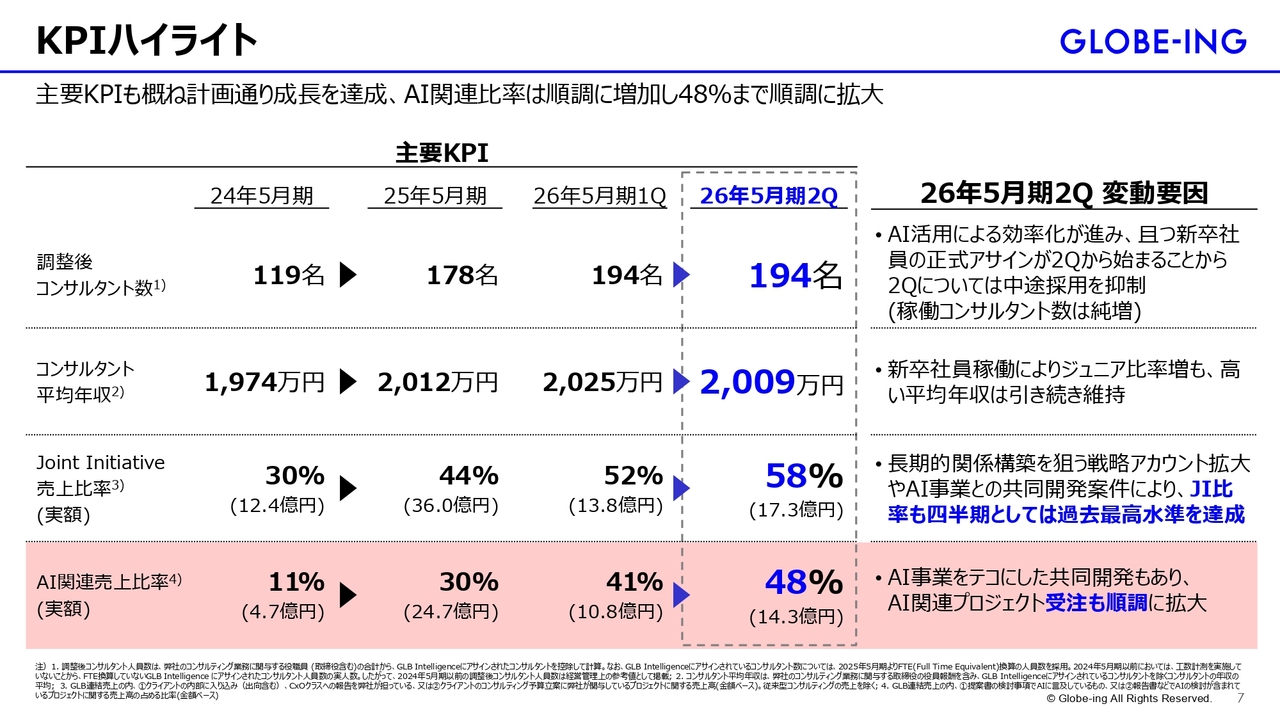 KPIのハイライトです。基本的には狙いどおりで、順調に推移していると考えています。第2四半期はJoint Initiative売上比率が58パーセント、AI関連売上比率が48パーセントと、非常に高まりました。