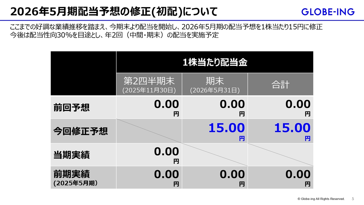 今期末の1株当たり配当金は、15円を予定しています。今後は通期を通して配当性向30パーセントを目標とし、年2回の配当を実施する予定です。