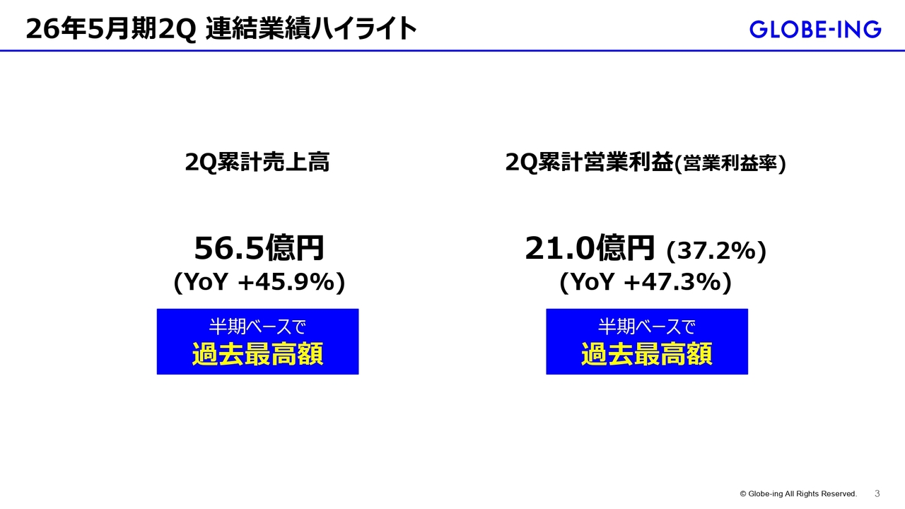 前年同期との比較でも、売上高はプラス45.9パーセント、営業利益はプラス47.3パーセントと力強い成長を達成しました。
