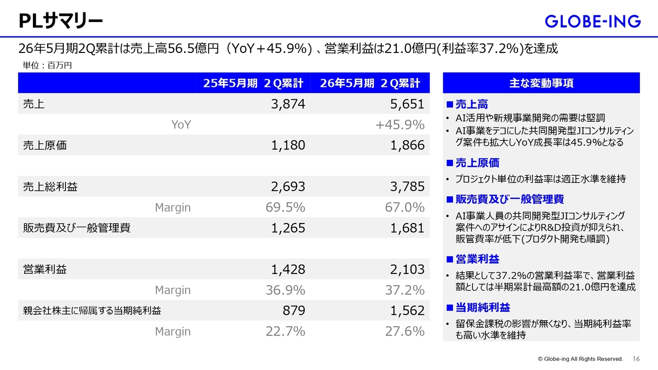 PLサマリーです。第2四半期累計の売上高は56億5,100万円で、前年同期比プラス45.9パーセントとなりました。AI活用や新規事業開発の需要が引き続き堅調に推移したことや、共同開発型AIコンサルティング案件の拡大が寄与しています。