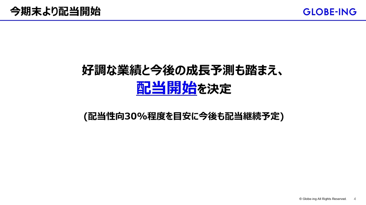 今回の力強い業績を背景に、今期末より配当を開始することを決定しました。基本的には、これまでの好調な業績と今後の成長予測を踏まえ、配当性向30パーセント程度を目安とし、今後も配当を継続していきたいと考えています。