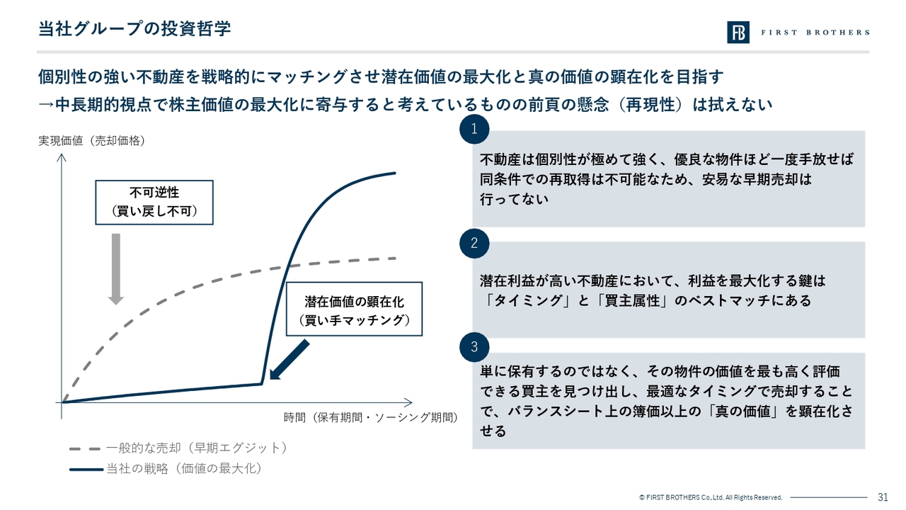 2点目は、中長期的な株主価値の最大化を優先するため、期間損益の変動(ボラティリティ)を許容している点です。当社は、会計期間ごとの利益を平準化するために、上昇余地のある物件を早期売却するようなことはしません。マーケット動向を見極め、その物件の潜在価値が最も顕在化するタイミングで売却を行うという投資規律を徹底しています。このためどうしても期間業績に変動が生じますが、これは中長期的な株主価値向上のためのプロセスであるとご理解ください。