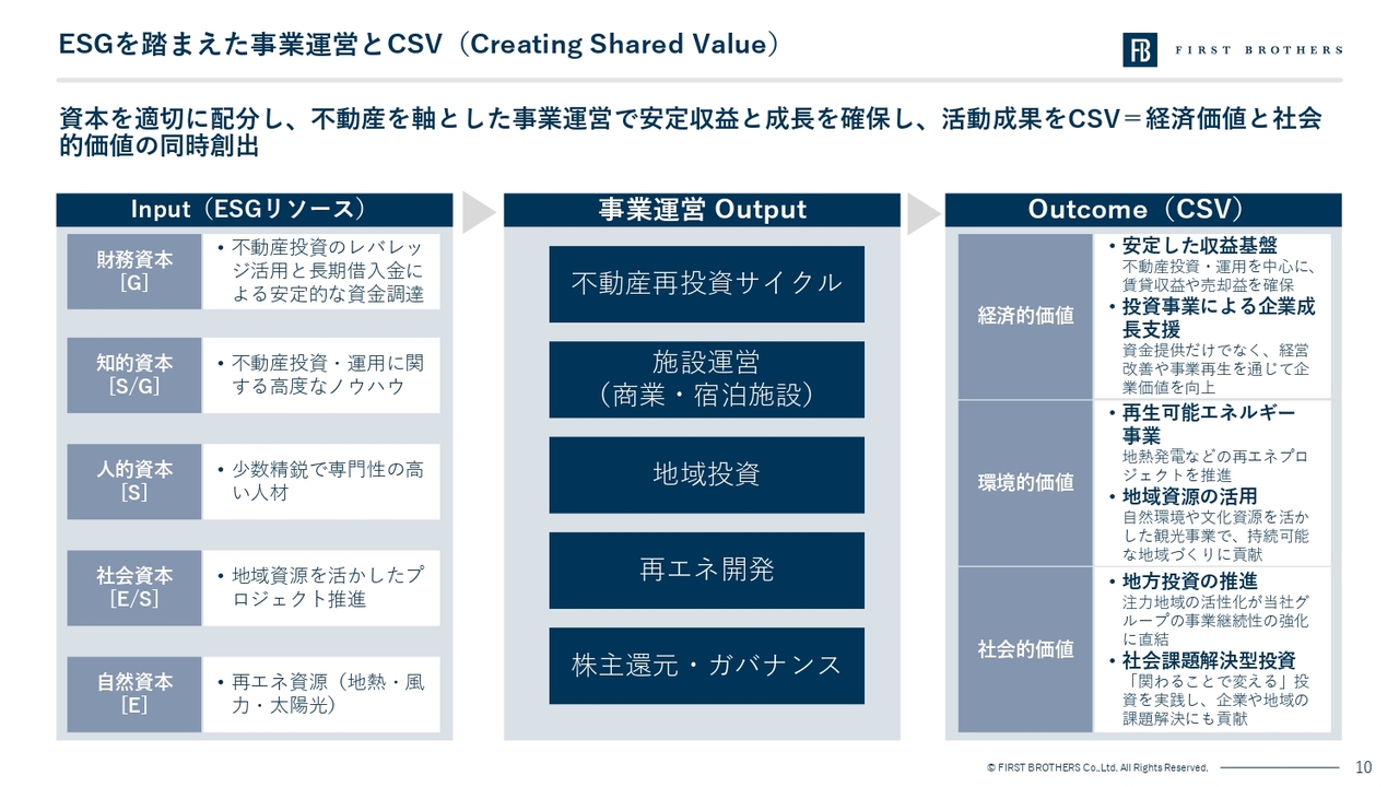 「地方の課題解決」と「投資リターンの最大化」の2つをトレードオフではなく、ビジネスの力で同期させることこそが、ファーストブラザーズが目指すCSV経営です。
